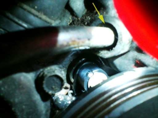 | ↑ 黄色い矢印の奥のパッキンか何かが劣化して、この穴からオイルがあふれ出てくる。なかなか目が届かない部分なので気がつきにくく、クランクケースからのオイル漏れと誤認しやすい。 |