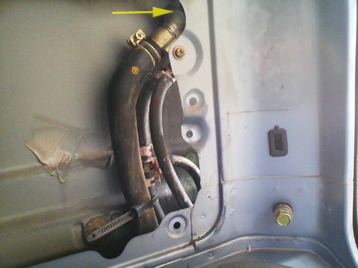 | サンバーのラジエータキャップ周辺の内装をはがして、配管をあらわにしたもの。黄色い矢印部分のパイプが腐食して穴が開く。 ↓ |