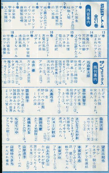 多分単行本の綴じ込み用中折れカタログです。鉄腕アトムが「9月現在E刊まで発売」なんて書いてありますので昭和50年の物でしょうか?なお裏面の永井豪「アラーくん」の右は「なんでもチイ子」です。また鉄腕アトム各巻は画像どおりには編纂されませんでした。詳しくは朝日ソノラマ・その2へ