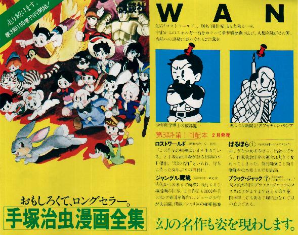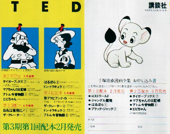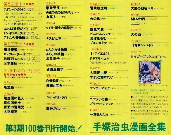 手塚治虫全集第3期刊行開始のカタログです。昭和57年の2月ごろの物です。裏は第1期・第2期の既刊案内になっています。(画像省略) かなり複雑な折り方になっていて、表(中央)の左のキャラクターの表紙をめくると「WANTED」と見えるように工夫してあります。レオのページが裏表紙になります。さて折り方を考えて見てください。