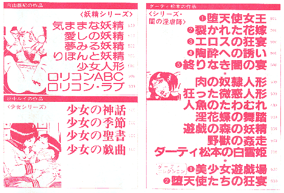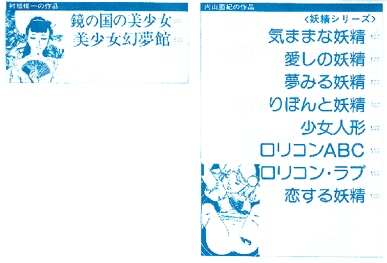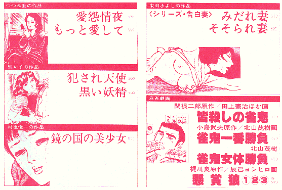 ええと、、、若気のいたりです。(笑) 昭和57年7月現在の綴じ込み用中折れカタログです。(どの本に入っていたかは秘密です) 久保書店てのは「月間レモンピープル」のあまとりあ社と同じ出版社なんですかね?「はしもとてつじ」なんか絵柄が清潔そうで読んでみたいです。