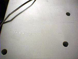 ![]() | 「素材の問題あり」というのがこれです。中央に筋が水平に入っていますが、何を隠そう左上のケーブルが溶かしてしまった痕です。ケーブルをスピーカに巻いておいたらこの有様でした。おいおいαデータ、もうちょっと材質考えて作ってくれぇ! |