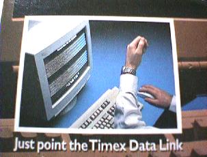 ![]() | こんな感じでCRTディスプレィに腕時計をかざして、付属ユーティリティで画面にバーコードみたいな光をチカチカ光らせてデータを受信します。液晶ディスプレィでは使用不可能です。 |