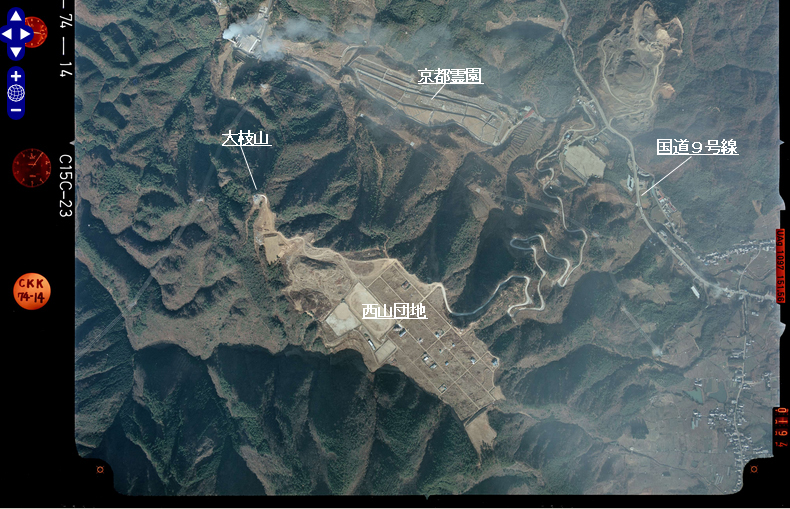 | ↑ 1974年撮影の航空写真。大枝山周辺は地山や砂利道ばかりの拓けたスペースが豊富。ロケ地はまずここに間違いないと思われる。映画関係者としては非常に美味しいロケーションだったろう。 ・大枝山から西山団地にかけては、標高400m以上の高地で、非常に見通しが良い。 ・西山団地はほとんど建物が無いので、現代物の映り込みが少なく、辺鄙さゆえにヤジ馬も集まりにくい。 ・国道9号線から連絡道路があるので、アクセスが容易。 ここまで絞り込んだら、現地の画像が欲しいところだが、現在の大枝山は樹木が伸びて、あまり眺望がよくないらしい。また西山団地は「関係者以外立入禁止」だそうで、グーグルのストリートビューすら入っていない。 どなたか物好きな方、行って写真を撮ってきませんか? |