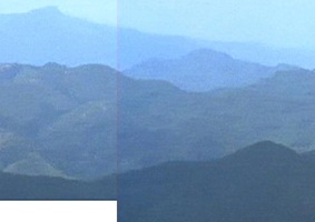 | これを大雑把に切り貼り合成して、遠景の山並みを明確にしたもの。 (切り貼りの範囲選択がいい加減で、ところどころ階段状の色ちがいになっている) ↓ |