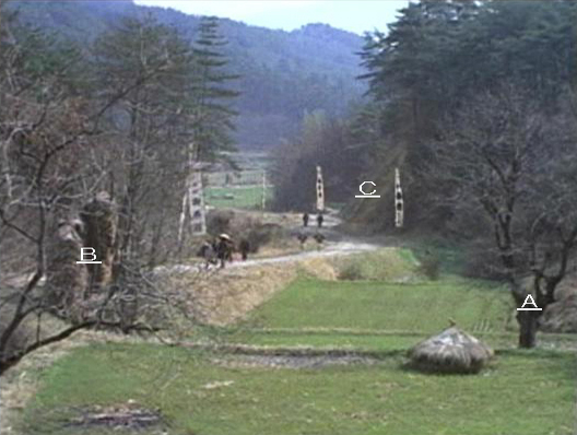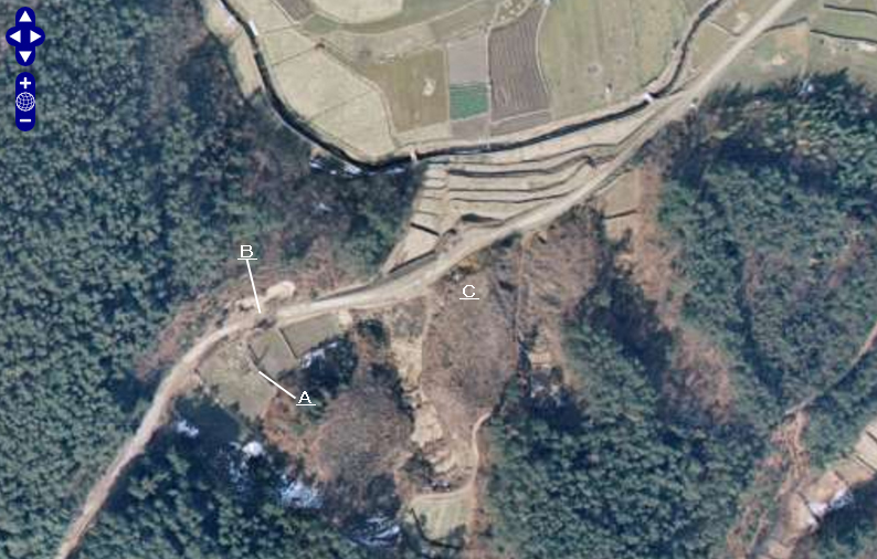 | ↑ A−あぜの1本の木 B−道沿いの数本の木 C−片切り通しの道 手前の田んぼの配置・形状 | A−あぜの1本の木の影 B−道沿いの数本の木の影 C−片切り通しの道 田んぼの配置・形状 ↓ |