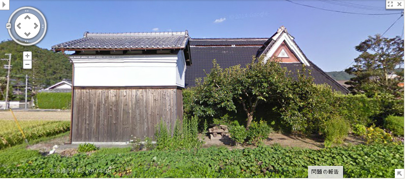 | 民家のすぐわきの道路(紋次郎たちの歩いていた道)からの画像のため、本編のような「引いた画像」とイメージが異なる。特徴的な屋根上部の形状が見えていないが、ストリートビューで左右に移動してやるとよく確認できる。 ★注意:個人宅ですので、詳細な住所は明らかにしません。「山王寺(犬飼天満宮)の近く」とだけお答えしておきます。現地に行かれた場合には「勝手に敷地に立ち入る」「大声で騒ぐ」「無断で写真を撮る」など「非常識な行為」は慎んでください。 |