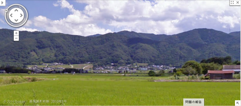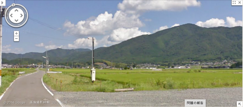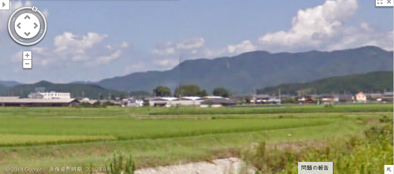 | グーグルのストリートビューで、画像Aと同じ位置から北方向を見た画像。遠方の山並みが一致。 ↓ |