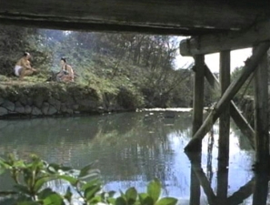 | 橋の反対側から見た焚き火シーン。川は向かって右方向に折れて流れている。 ↓ |