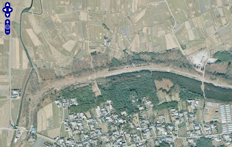 | ↑ この画像の中央あたりの河原にセットを組んで撮影したと考えられる。この川は「七谷川」といい、東から西へかけて流れ、画像の端で南に向きを変えている。見てのとおり水はほとんど流れていない。両岸に堤防が見え、川筋は東の方へ緩やかに曲がっている。よく見ると河原に道まである。 |