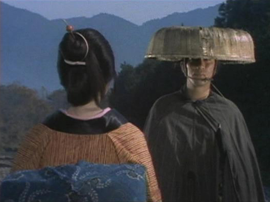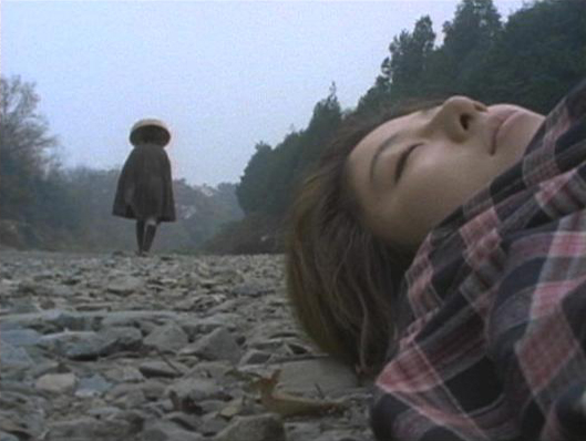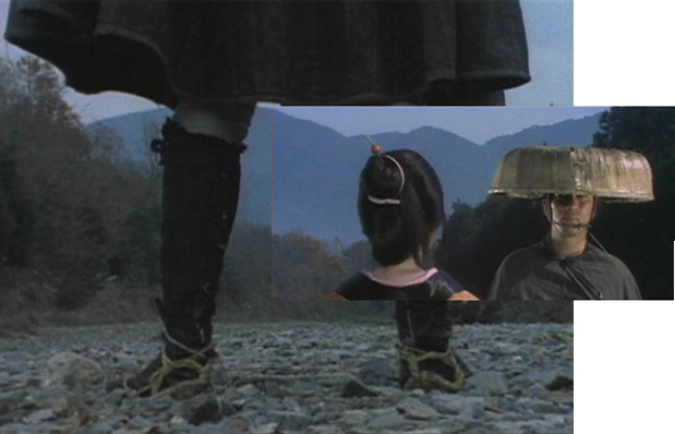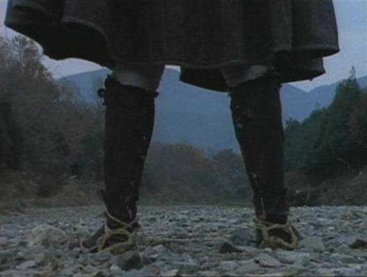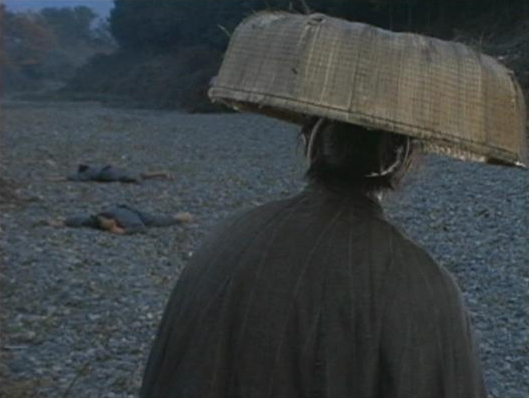 | 石ころだらけの河原に立つ紋次郎さん。このあとヤクザが左右からワサワサ現われる。 ↓ |