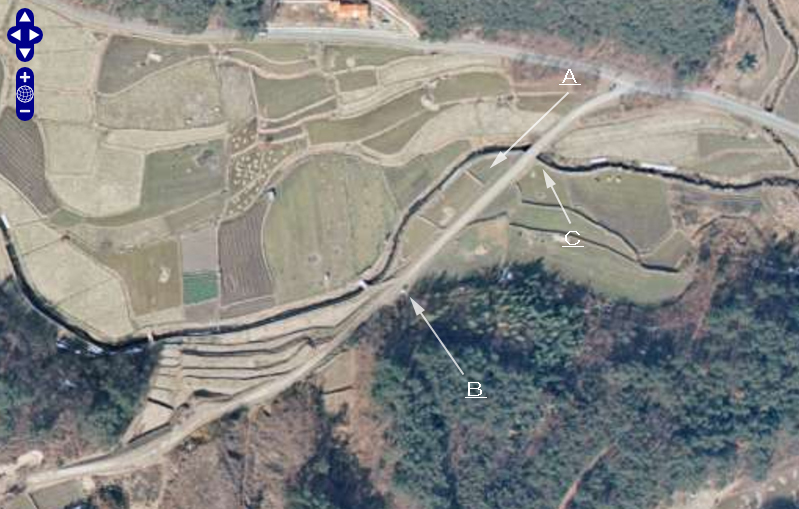 | ↑ A−紋次郎と早馬が来た方向 B−御休処の場所 C−橋 |
