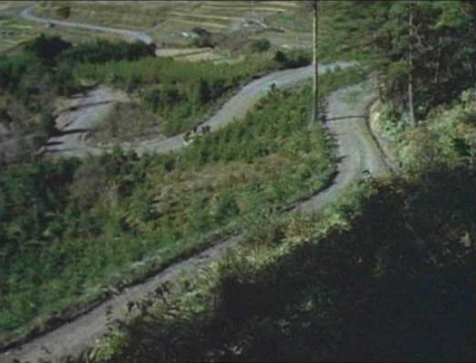 | 以上の共通点から「駈入寺に道は果てた」の街道のロケ地はここだと考えられる。 現地は現在どうなっているのかというと、植えられた杉がよく育って「杉林」と化している。ストリートビューも通っているが、見とおしが全く効かない。 |