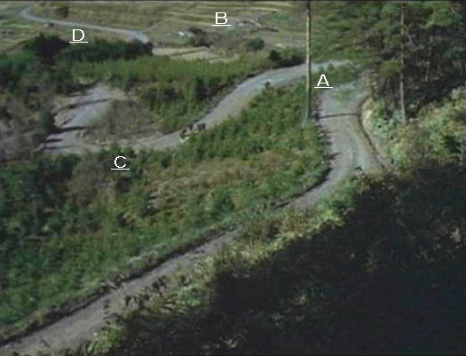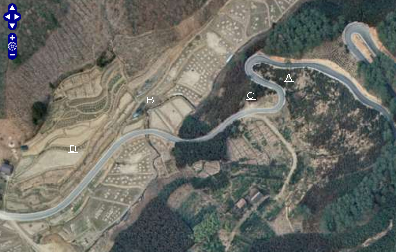 | ↑ A−道路沿いの一本杉 B−物置小屋らしき物 C−カーブ内側の荒地の形 D−道路沿いの棚田 | A−道路沿いの一本杉の影 B−物置小屋らしき物 C−カーブ内側の荒地の形 D−道路沿いの棚田 ↓ |
