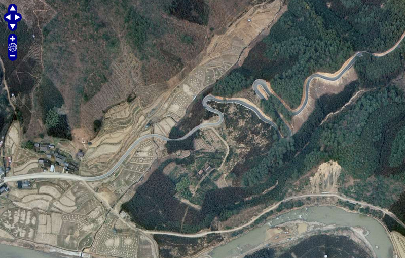 | 国土地理院の「国土変遷アーカイブ」による現地周辺の1975年撮影の航空写真。 撮影当時は砂利道だったが、キレイに舗装されている。 ちなみのこの道路は、現在「国道477号線」の旧道となっている。 ↓ |