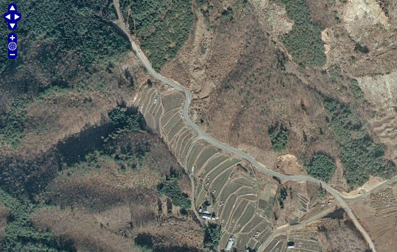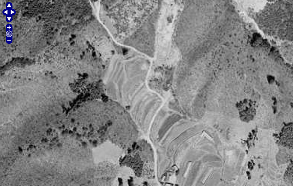 | 1969年時点では見るからに貧弱な山道だったものが、1973年には大規模な道路改修が行われている。山を下る主ルートも、南東方向に新設されている。 現在、画像の北西奥にはゴルフ場があるが、おそらくその造成工事および完成後のアクセス用に改修されたものであろう。 映像の道の曲がり具合から見て、ロケ当時は1969年の画像と同じ状況だったと思われる。 |