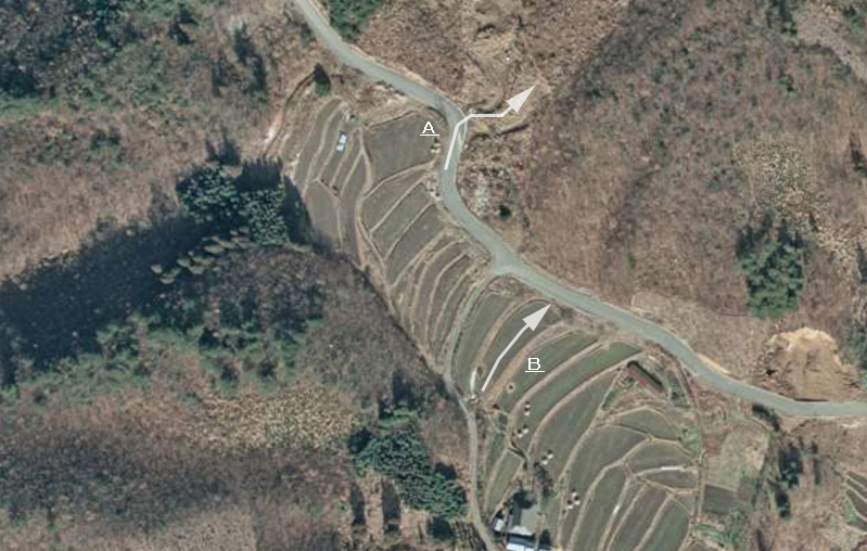 | 道の曲がり具合や、奥の上方にまっすぐ延びる道を勘案した結論がこれ。 ↓ |