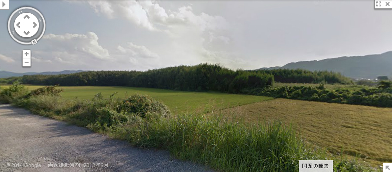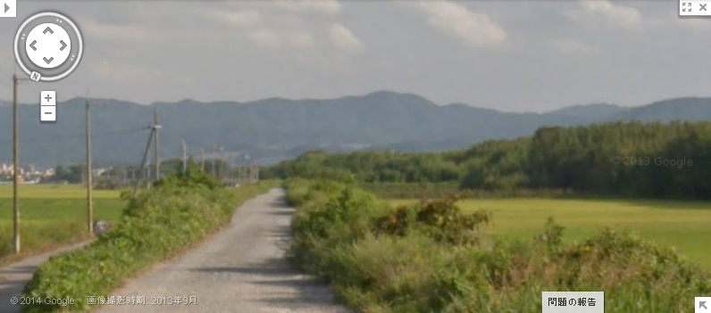 | グーグルのストリートビューの画像。おおむね南の方向を見ている。遠方の山並みは霞んでいて見えない。 もう少し南下した場所からの画像が欲しいのだが、ここからストリートビューが脇道に降りて行ってしまい、西方向の見通しが効かなくなる。 ↓ |