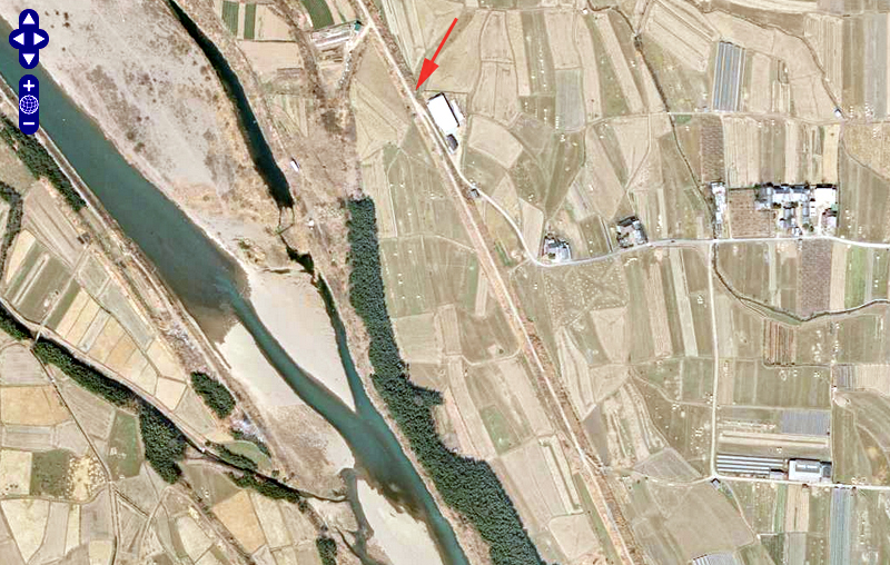| グーグルのストリートビューの画像。画像Aと同じ場所から、堤防上の道をやや東に振ってズームしたもの。遠方の山並みが一致。 ↓ |
