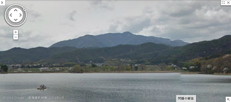 | グーグルのストリートビューの画像。おおむね北西の方向を見ている。右の方に画像同士の繋ぎ目のずれがあり、本来ゆるやかな山並みがくぼんでいる。 ↓ |