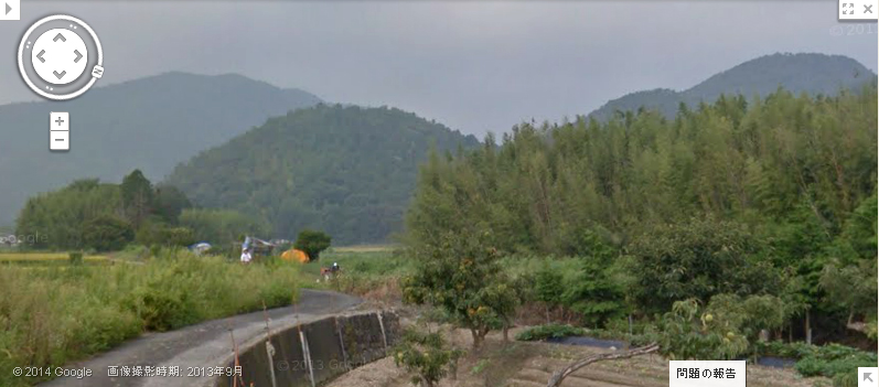 | 現地のやや北東地点から南西方向を見たグーグルのストリートビューの画像。左手の小ぶりな森にもっと近づきたかったが、ここでストリートビューが途切れていた。ご覧のとおり山並みが一致。 ↓ |
