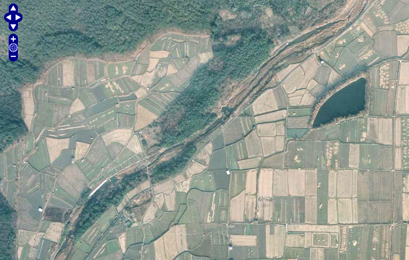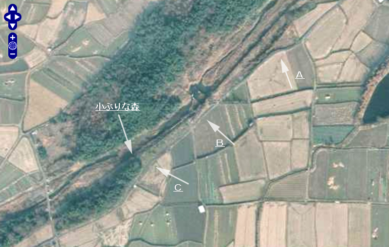 | 「犬飼川」が南西から北東に向かって流れている。堤防と道の間に、映像に見られるような荒地がある。 北東方向に進むとして、Bのあたりで若干左に曲がり、元の軸線に戻った後、Aのあたりで右に曲がっている点が画像Aと合致する。 また南西方向に進むとして、Cのあたりで左に曲がり、森の横を通る点が画像Bと合致する。 |
