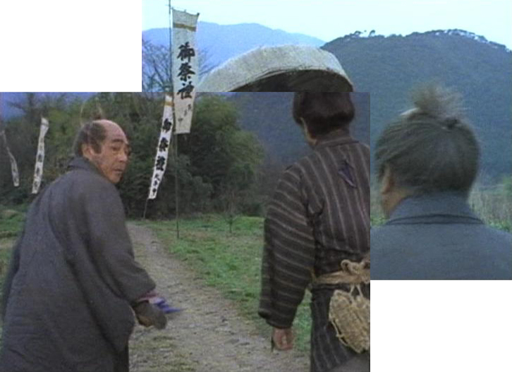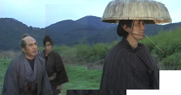 | 紋次郎に同道してもらえて、ひと安心の田崎潤。(切り貼り合成画像) ↓ |