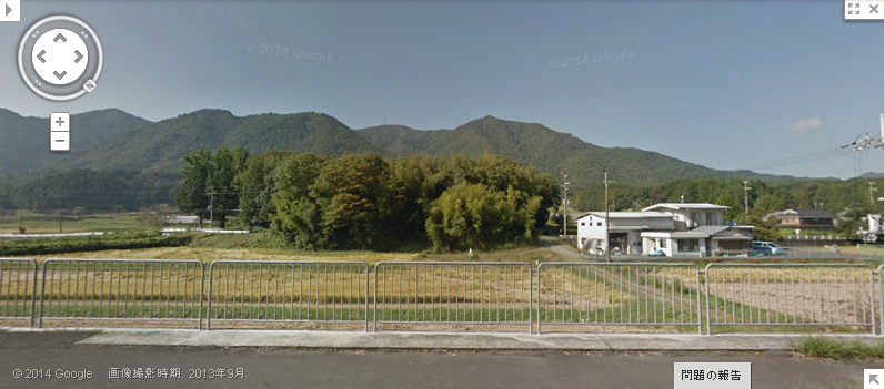| 現地から画像Aと同じ方向を見たグーグルのストリートビューの画像。こんもりとした森がちゃんとある。 ↓ |