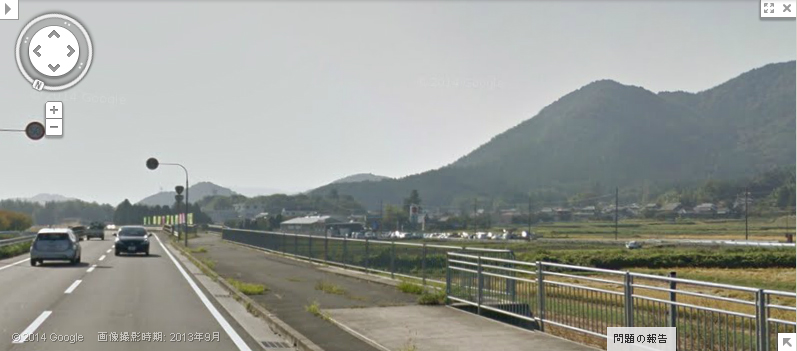 | 同じ方向を見たグーグルのストリートビューの画像。画像Bにわずかに映っている山頂や斜面が確認できる。 (撮影時のカメラ位置と同じ場所ではないので、若干ずれている) ↓ |