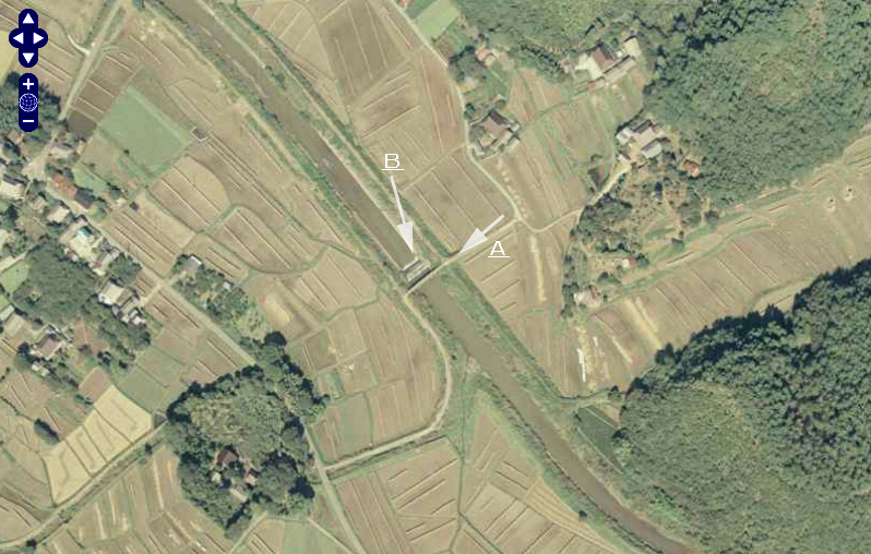 | ↑ 流れているのは本梅川。南東から北西に向かって流れている。橋の北西には堰がある。 A−画像Aのカメラの向き。 B−画像Bのカメラの向き。 ↓ |