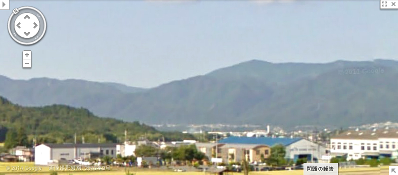 | グーグルのストリートビューの画像。現地周辺は見通しが悪かったため、南に200mほど離れた地点から北東方向を見た。山並みが一致。 ↓ |