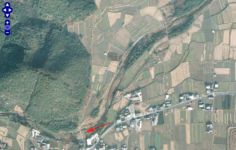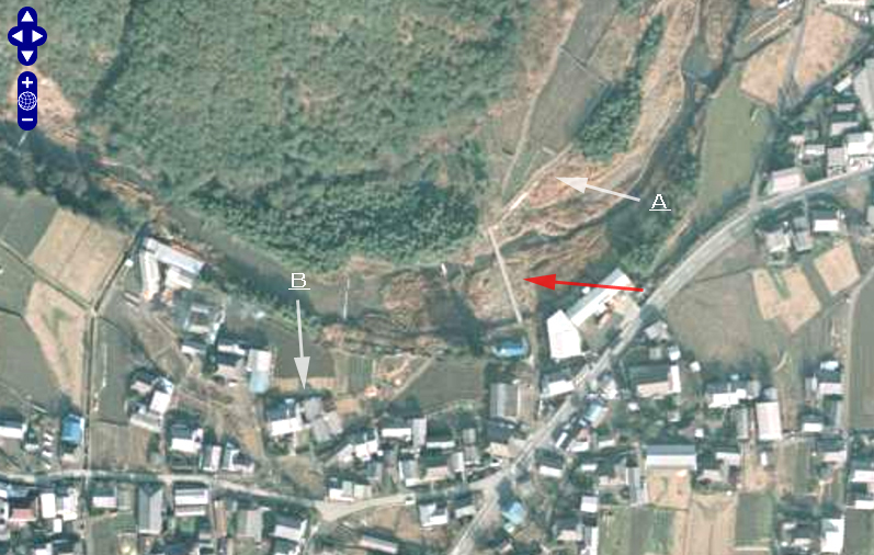 | 木立ちから南西に延びる道がAのあたりで曲がっており、画像Bと一致する。またAのあたりから南西方向を見た時、画像Cのように橋の北端と民家(おそらく矢印B)が映りこむ。 以上のことから、橋のロケ地はここだと考えられる。 |