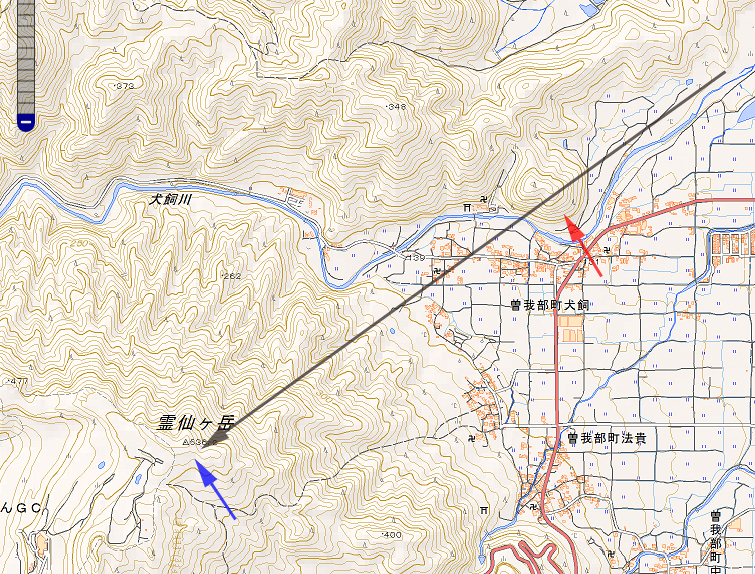 | ↑ 国土地理院の「国土変遷アーカイブ」による現地周辺の地図を使って検証してみる。 画像A・画像B共に、左手奥に映っている高い山(霊仙ヶ岳)は「青い矢印」であり、手前に映っている山(名称不明)は「赤い矢印」である。両者が画像Aの様な位置関係に見えるのは、「黒い矢印」のようなラインで撮影した場合である。それはきちんと「犬飼下和田」「犬飼上和田」を通っている。 |