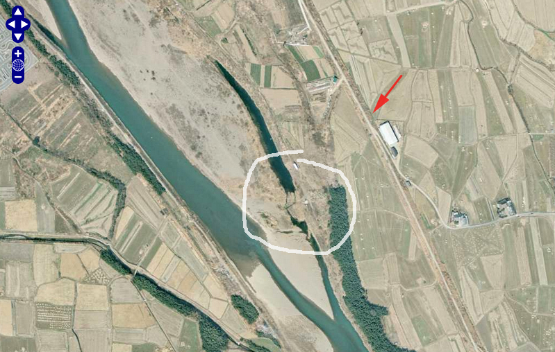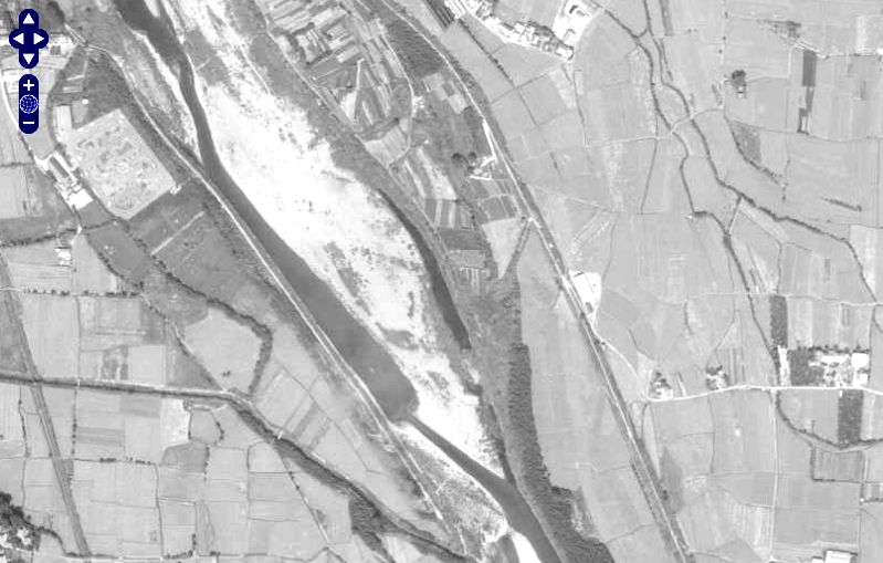 | 国土地理院の「国土変遷アーカイブ」による現地周辺の1975年撮影の航空写真。ストリートビューの画像は、赤い矢印のあたりから取得した。白丸の範囲が推定ロケ地。白丸を南北に通る緑色の帯は、増水時にできた水たまりであろう。 ↓ |