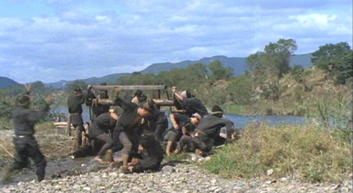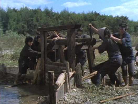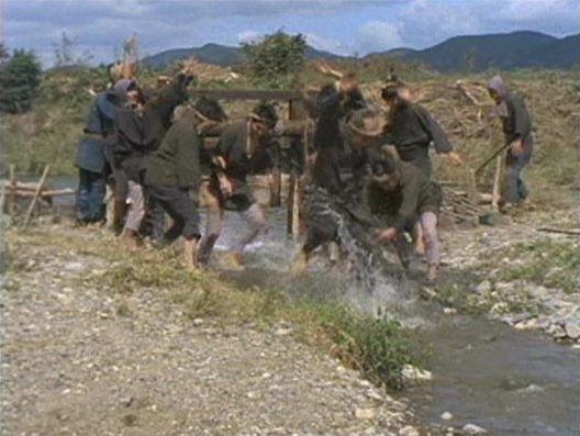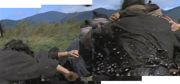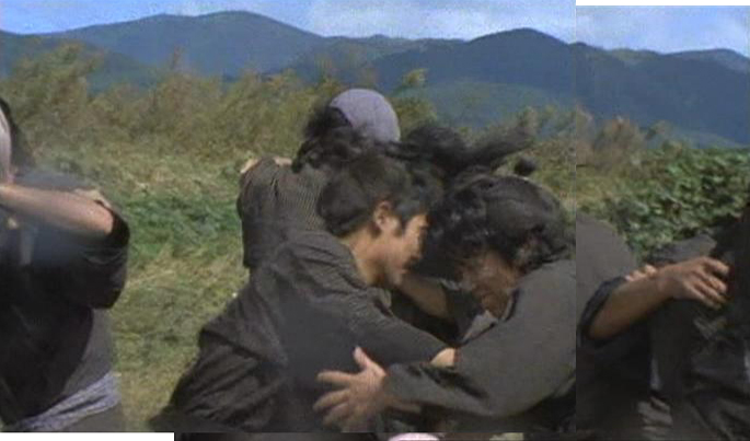 | 激しく争うお百姓さん。動きの激しいシーンが多く、カメラが傾いているようで、山並みの傾き具合いが不自然。(切り貼り合成画像) ↓ |