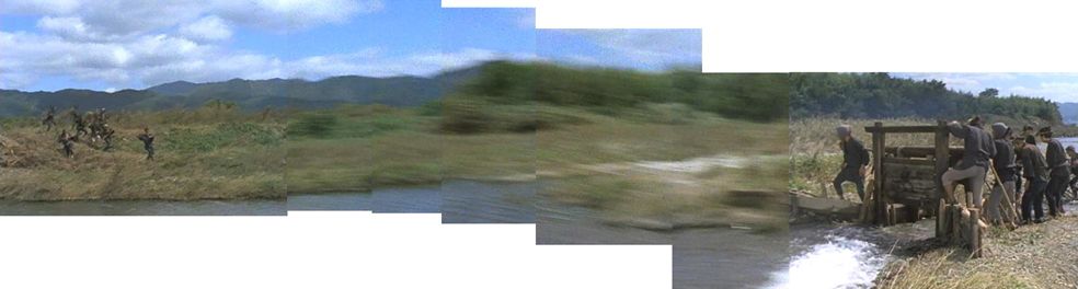 | これも勢いよくをパンしているので、カメラが傾いている。堰の設置された場所の右手には木が繁っているが、左手は拓けている。(切り貼り合成画像) ↓ |