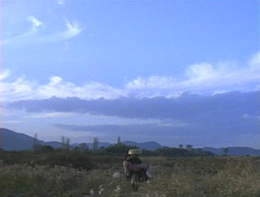 | 足元が砂地であることからも、河原であるとわかる。背景の細長い物体は鉄塔かと思っていたが、何かの細長い木だった。 ↓ |