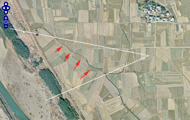 | 画像Aの堤防上の木立ちには切れ目がある。白線のような画角で撮影すると、そのような絵が撮れると思われる。また画像Aには、左手前から奥に伸びる細い木の列が見える。赤い矢印で示した場所に、用水路に沿って植えられている木の影が見えるが、それらが映り込んでいるものと思われる。 (カメラ位置はあくまでも推測です。もっと東でも特に問題ありません) なおここは「第26話 獣道に涙を棄てた」の田んぼの中の追いかけっこのロケ地のすぐそばである。 |