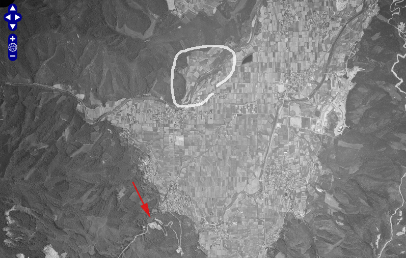 | 白い丸は推定ロケ地。赤い矢印は、映像の奥の山肌に見えている地山の崖。この崖は国道423号線沿いのつづら折れにあるが、現在は木立ちが繁って見えなくなっている。 |