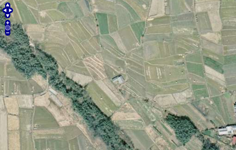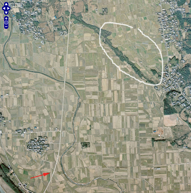 | ↑ 「全然違うじゃないか」という声も聞こえてきそうだが、推定ロケ地付近はストリートビューの空白地帯のため、映像の方向を考慮すると、下記画像の赤い矢印あたりから画像を取らざるを得なかった。はっきりいって、推定ロケ地からかなり離れているので、山並みが異なっている部分もある。白い丸が推定ロケ地である。かなり範囲が広いが、石垣を有した田んぼがごろごろしていそうなので特定は諦めた。 国土地理院の「国土変遷アーカイブ」による現地周辺の1975年撮影の航空写真。 ↓ |