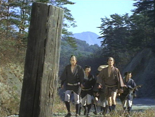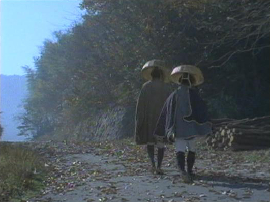 | 辟易しながら石垣の続く道を歩く紋次郎と林与一。 ↓ |