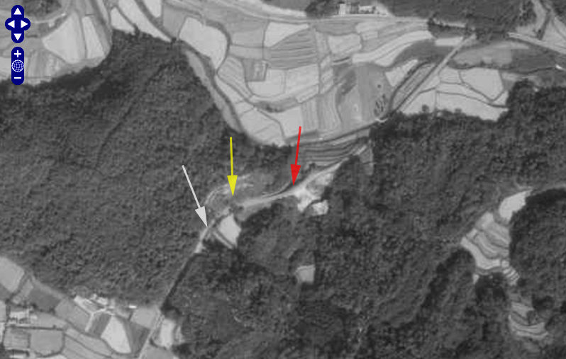 | 赤い矢印−紋次郎と林与一が絡まれる場所。(カメラは北東向き) 白い矢印−石垣の続く道。(カメラは南西向き) 黄色い矢印−山並みの見える土砂取り場。(カメラは北向き) 旧作で散々出てきたロケ地が「新」でも出てくるのはなかなか楽しい。しかし5年以上たつと、さすがにいろいろ変わるものだ。中でも道路の舗装化は痛かったことだろう。 |