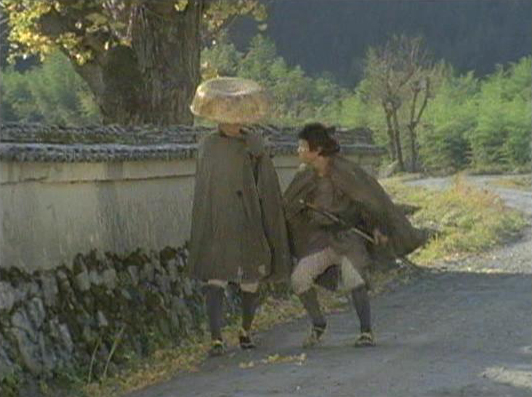 | ニワトリを取り返されたあと、紋次郎に気づいて馴れ馴れしくジャレついてくる高橋長英。 ↓ |