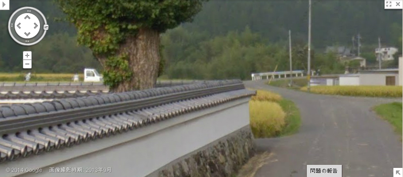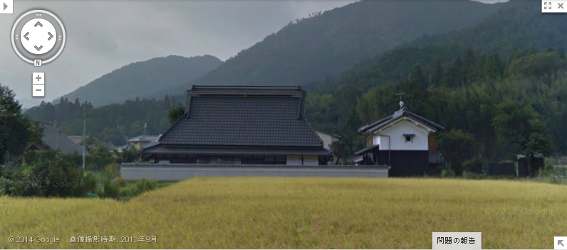| グーグルのストリートビューの画像。こちらは「京都府亀岡市曽我部町犬飼九ノ坪」の常徳寺の北西の角。塀がえらく立派になった。銀杏(?)の木は健在。 ↓ |