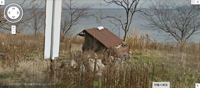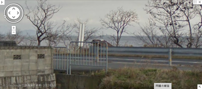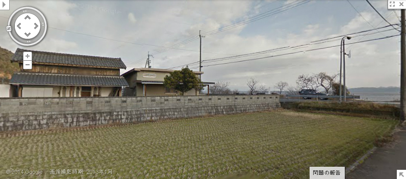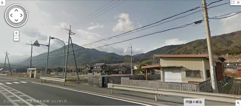 | グーグルのストリートビューの画像。山並みが一致。もちろん目の前のが網元の家。 ↓ |