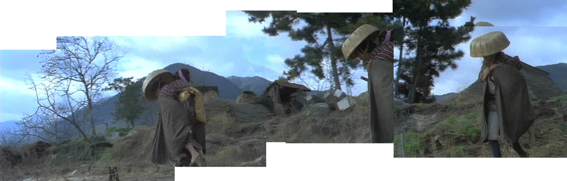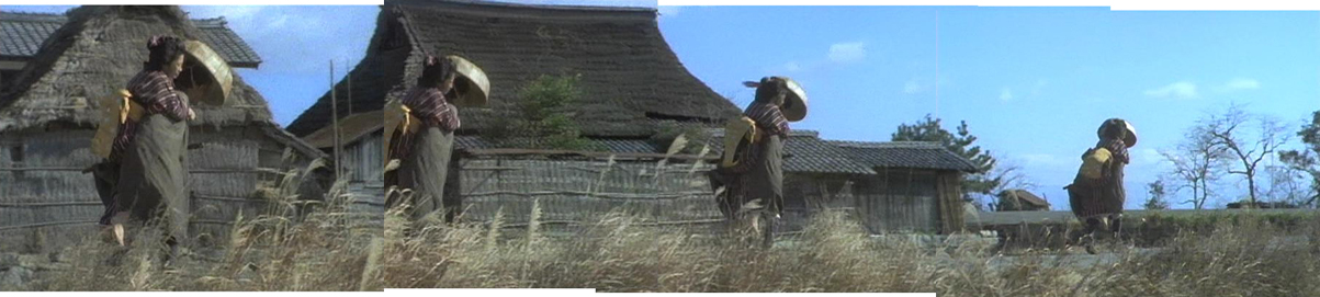 | 網元の家の前の海岸を、吉行和子をおぶって歩く紋次郎。上のボロい小屋が見えている。(切り貼り合成画像) ↓ |