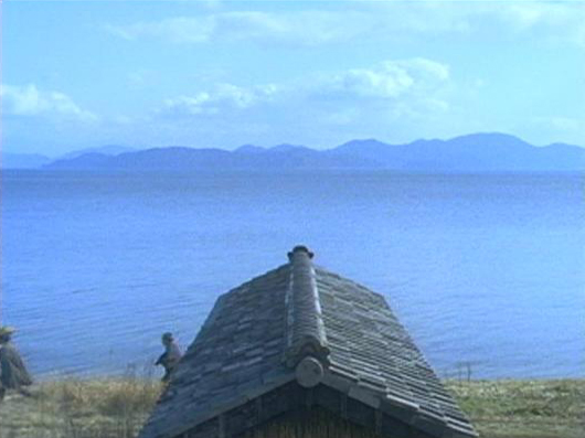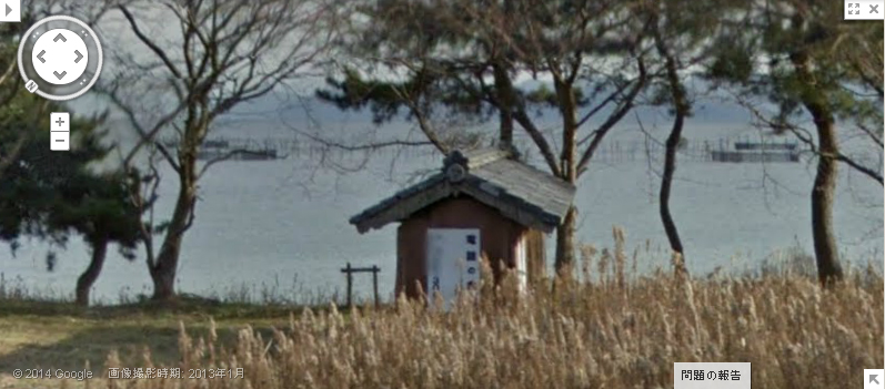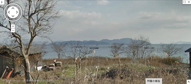 | ↑ ストリートビューの画像は「滋賀県高島市鵜川817−1」の少し北東。屋根瓦の形からして、この小屋に間違いなかろう。40年近くたてば木も茂るといったところか。 遠景の島が見づらいので、さらに北東からの画像 ↓ |
