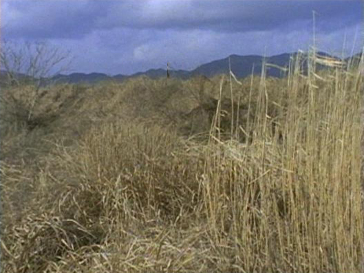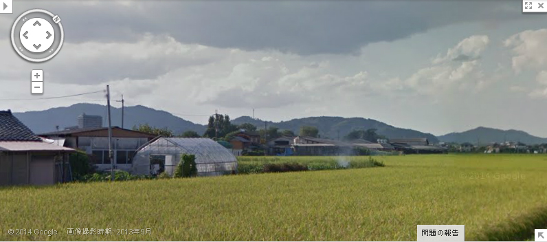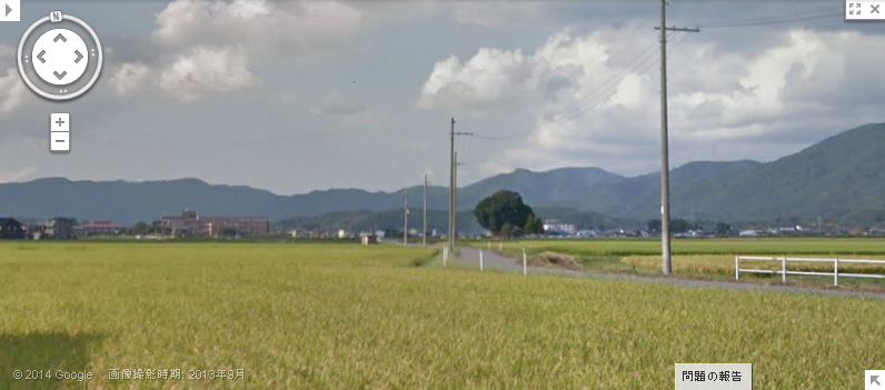 | 一応過去のロケ実績から、桂川東側堤防上の「河原尻蛇穴」と書いたが、あまり自信がない。なおストリートビューの画像は、堤防上からだと木立ちが邪魔だったため、やや東の田んぼの中から取得した。そのため山並みがしっくりこない。 |