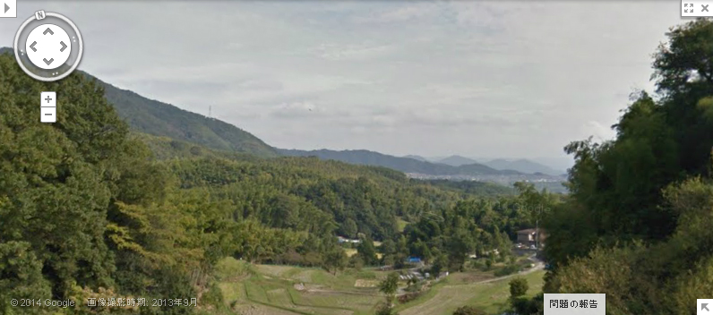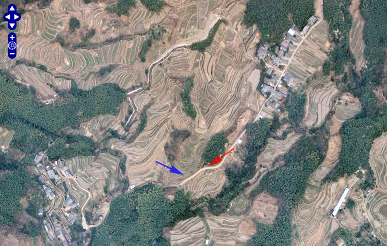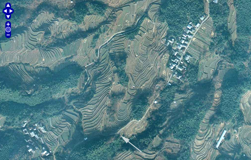 | ↑ すさまじいばかりの棚田のオンパレードである。ストリートビューの画像は矢印のあたりから取得した。ずばり矢印の場所がロケ地というわけではない。見通しの効く場所がそこしかなかっただけである。 |