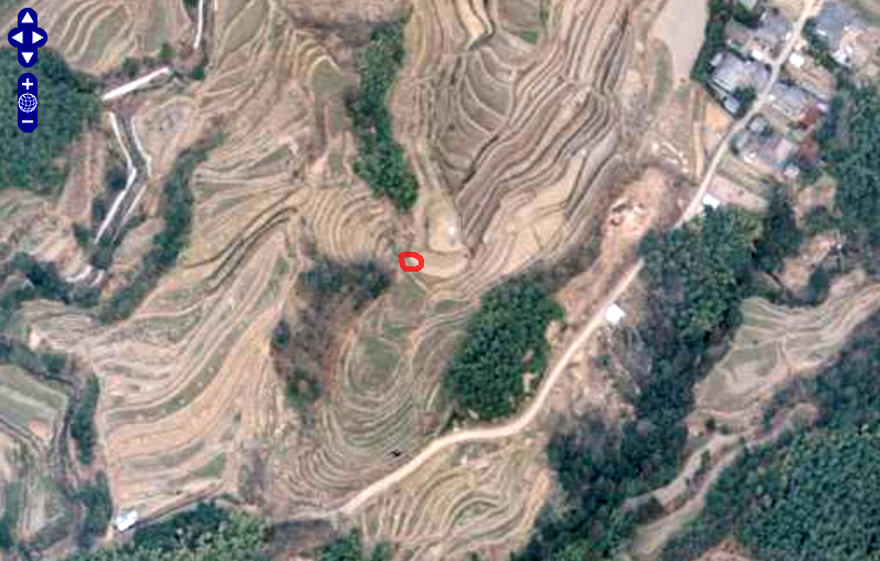 | ↑ 棚田の形から考えて、どうも赤丸のあたりに立って東の棚田を見つめたあと、北の方向に歩き出しているように思える。 ここで紹介した以外にも棚田のシーンが数多くあるが、大原野石作町の北方にも棚田が数多く点在しており、各々のロケ地を判定するのは難しいので紹介しない。 |